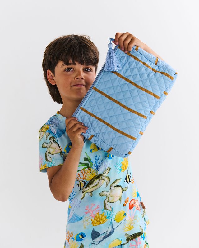 Pack a little style wherever you go! Our Como Stripe Quilted Cotton Toiletry Purse is soft, structured, and effortlessly chic, perfect for keeping your everyday essentials neatly organised. The quilted cotton gives a soft, luxe feel, while the generous interior makes packing for travel and weekend adventures easy. Featuring calming blue and brown vertical stripes with a matching blue tassel, this bag adds a touch of understated Kip&Co charm to every day.