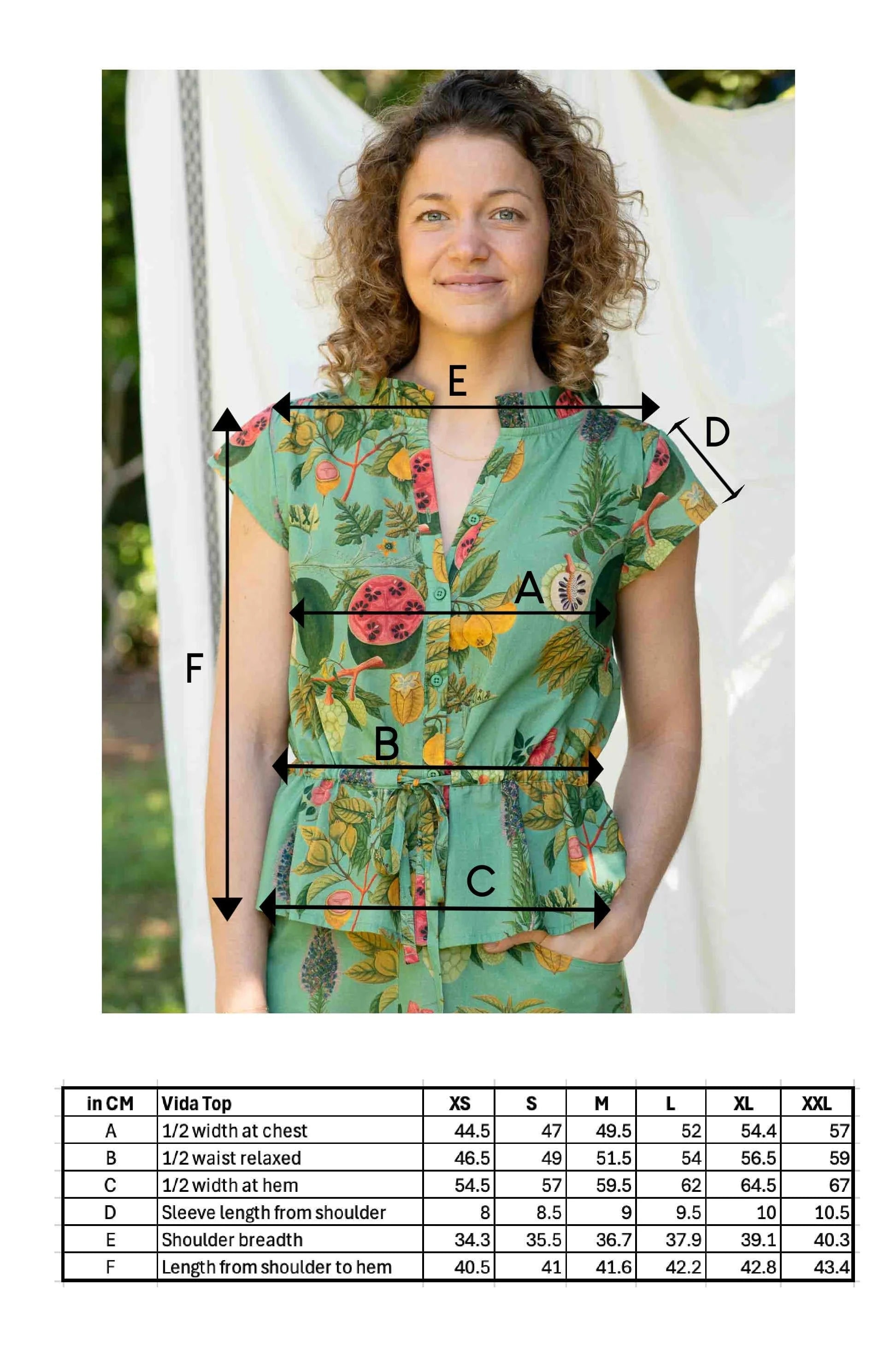Helene wear Vida top in Flora back with Ollie linen pant in Mineral Green in Size S. See photos for a size chart.