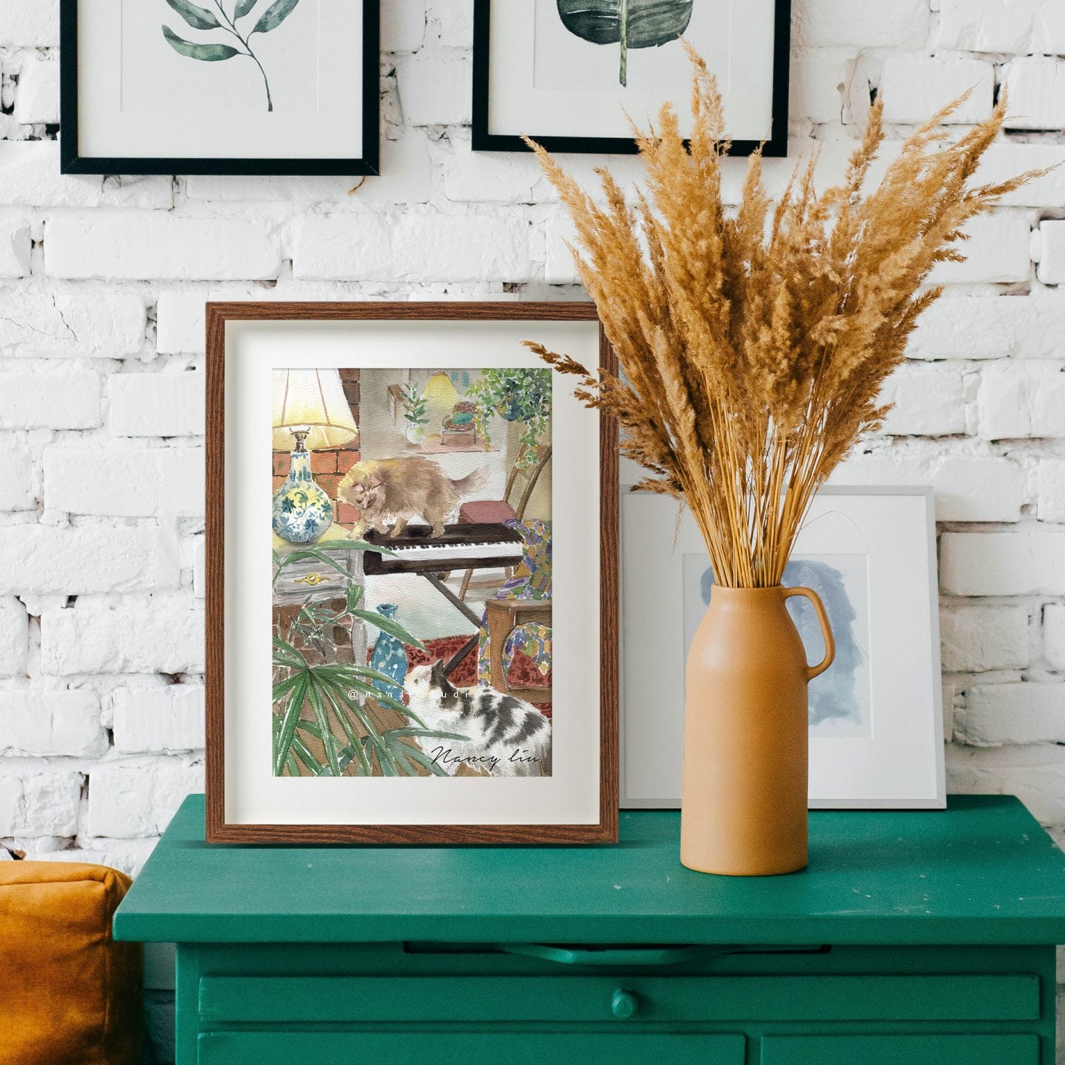 looking a special gift for your cat lover friends or family? This cat art print might just be perfect. The artist, Nancy Liu capture the fun moment when her cat Gismo was walking pass the piano and piggy(her other cat) were looking at his brother.