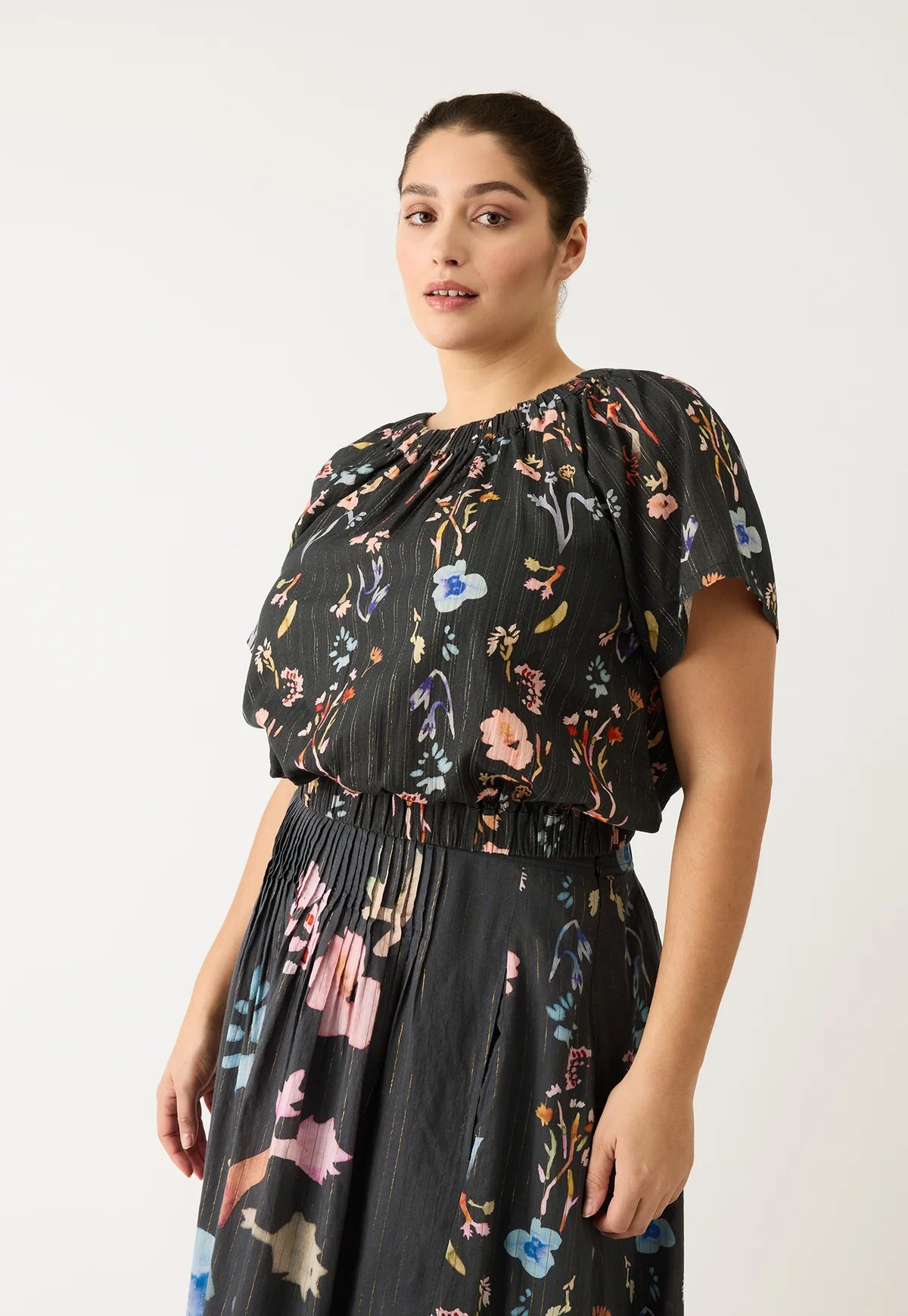 The Daphne Top is a a summer-ready style made in cotton voile with metallic thread fabric, with a relaxed feel and flattering fit. Featuring an exclusive floral print by Nancybird founder Emily Wright.