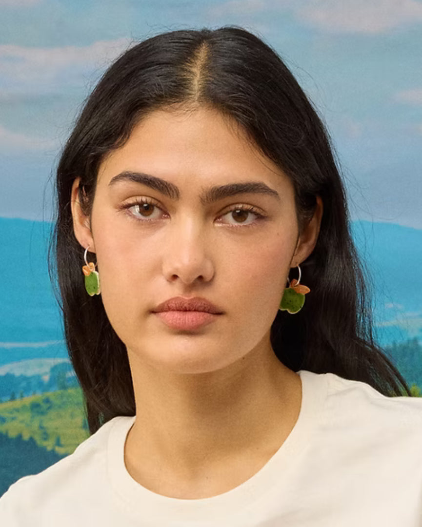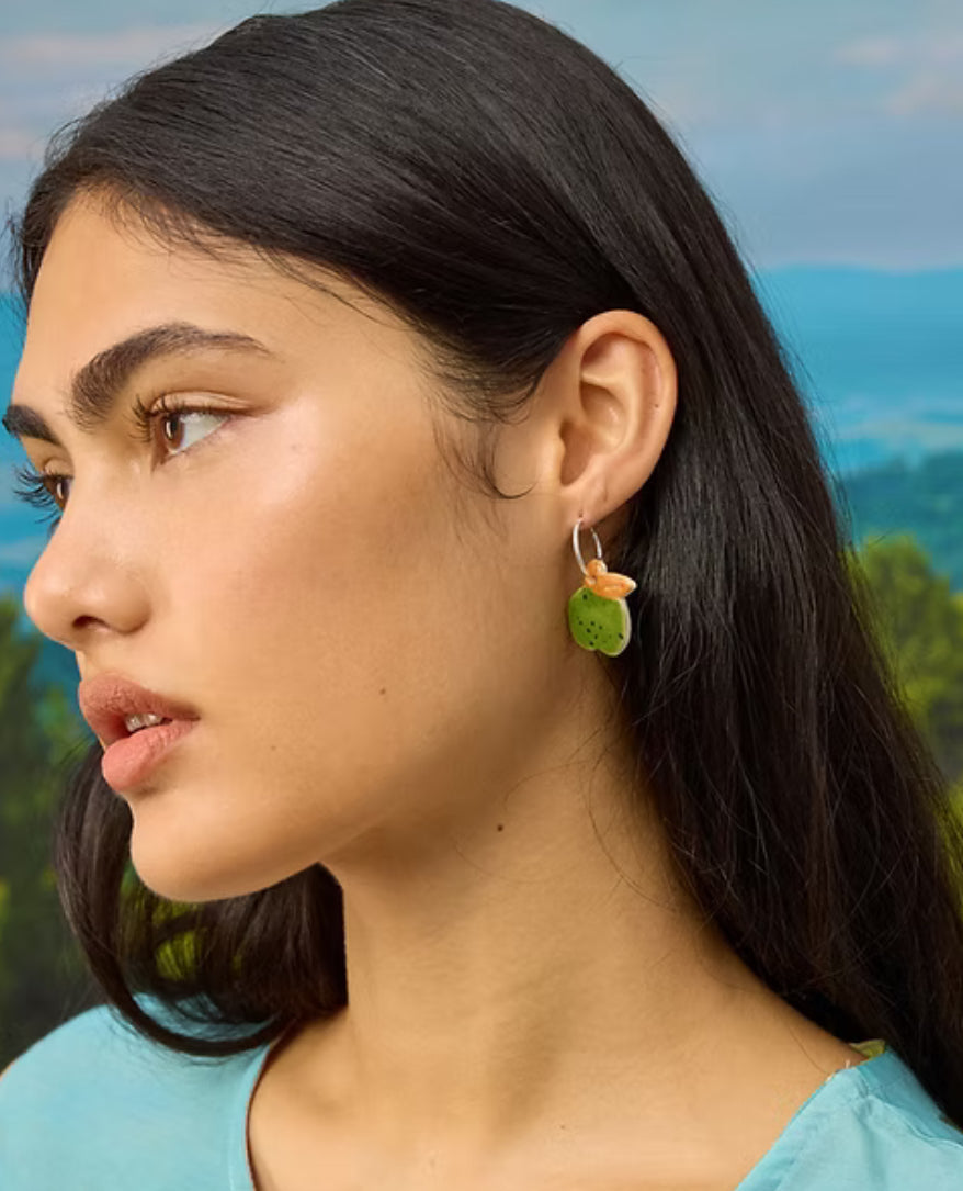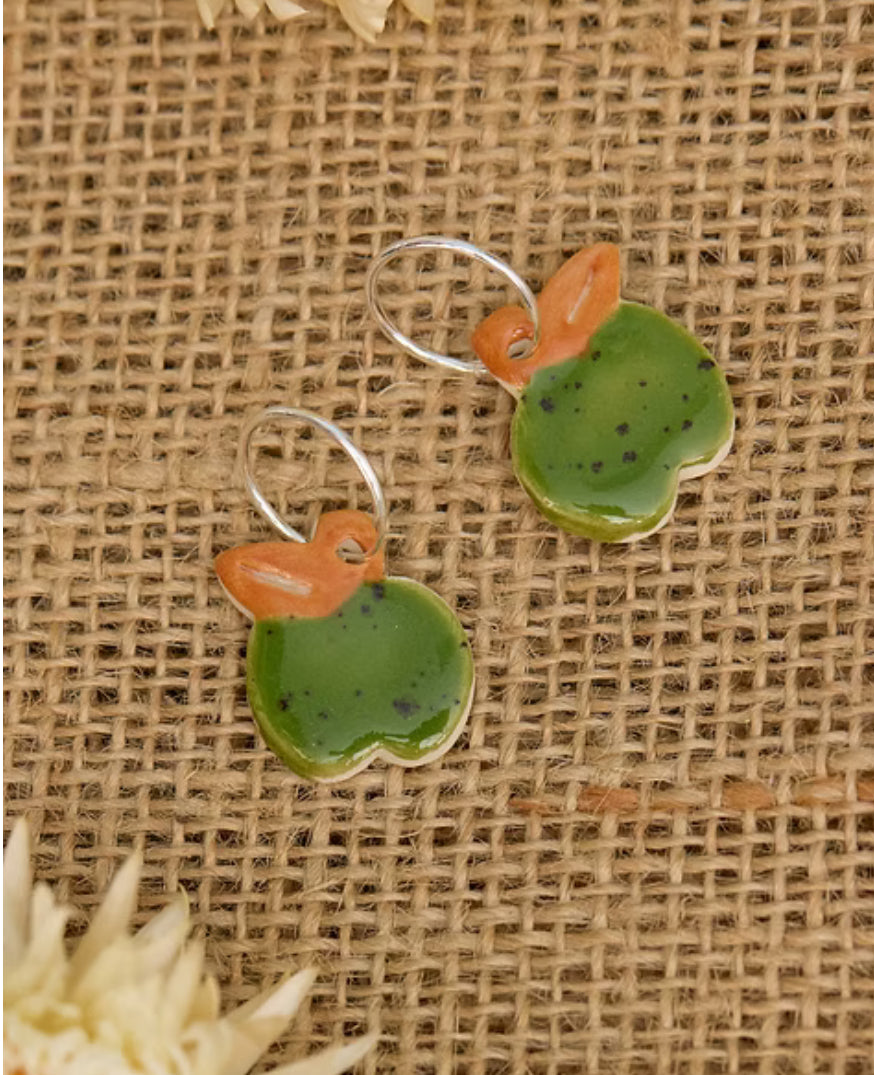 The Apple mini hoop earrings feature lightweight hand built ceramic pieces suspended on 16mm sterling silver sleepers.