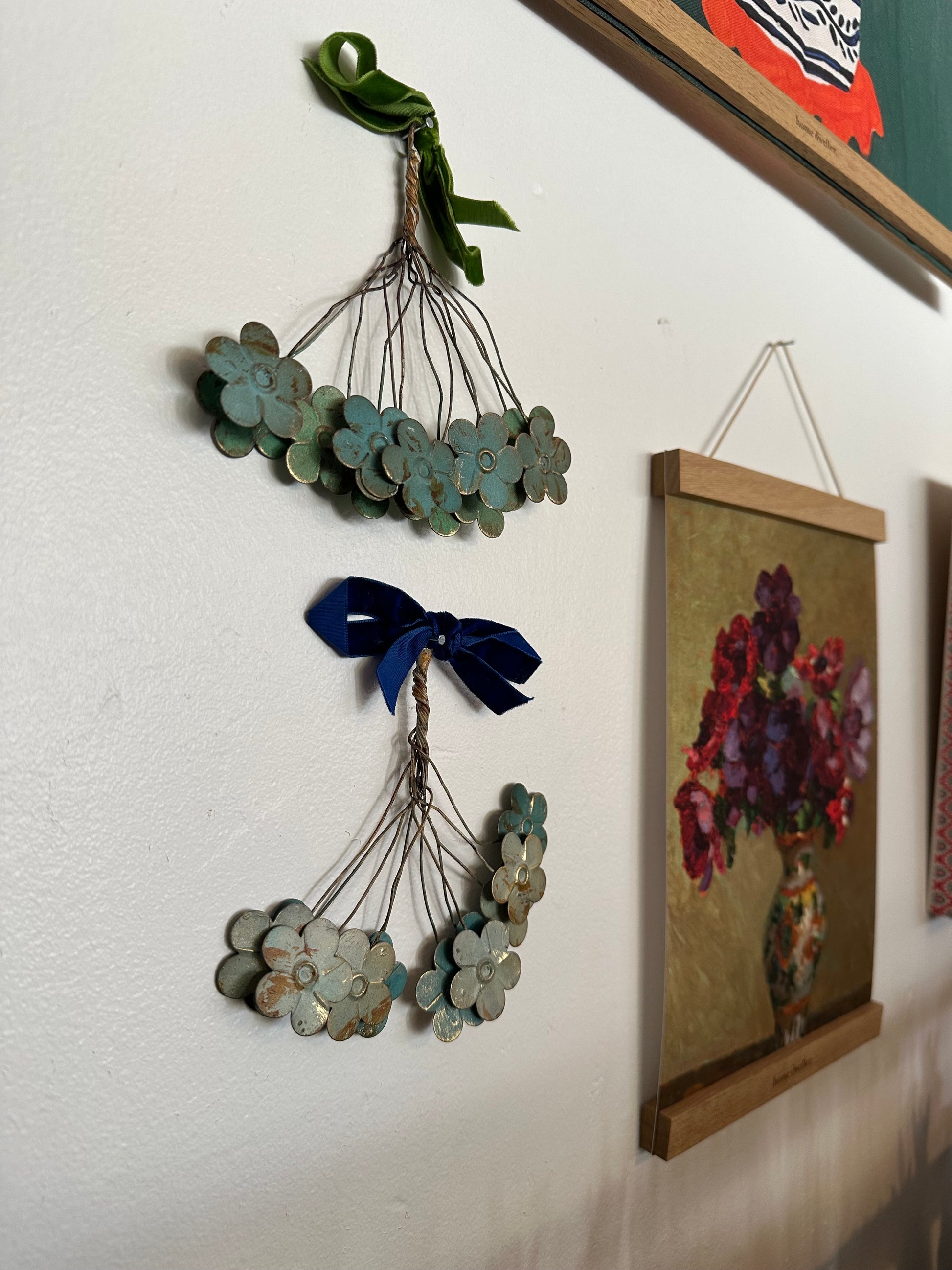 Metal bouquet tied with a sea green or blue velvet ribbon.