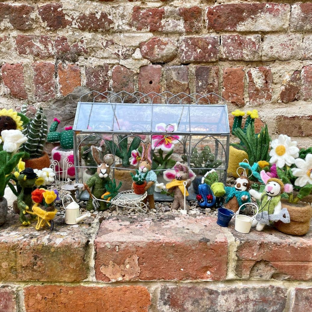Greta has been as busy as a bee down the bottom of the garden all spring, all of her seeds have sprouted and bloomed, check out the beautiful sunflower she grew! Greta comes wearing a wet felted sunhat and apron, with a felt trowel hand stitched to her paw, and her fabulous sunflower stitched in the other paw. Greta has been handmade using sustainable and biodegradable material under fair trade working conditions.