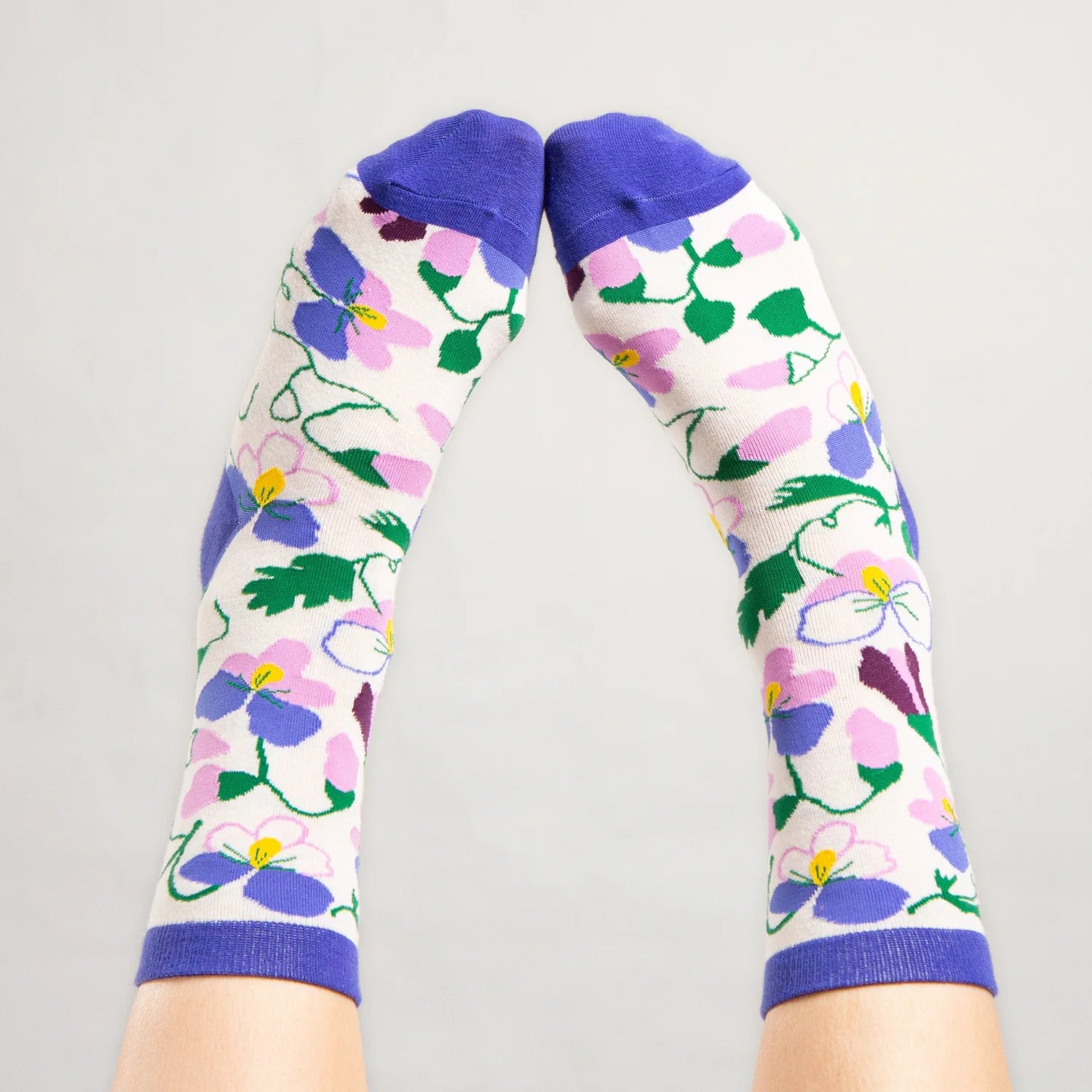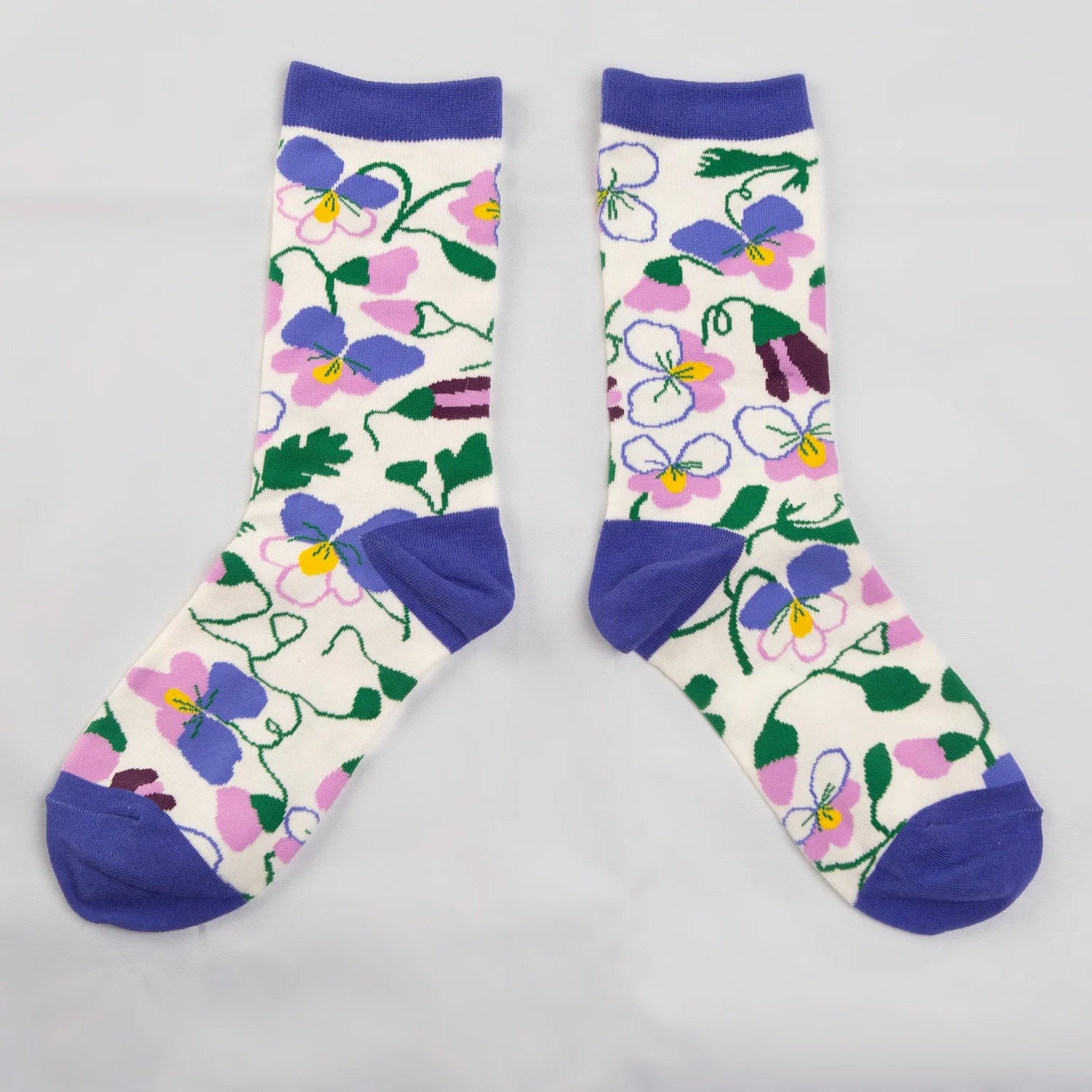 These sweet and playful socks feature hand-drawn pansy flowers in soft tones of blue, pink, and green, knitted into a soft off-white base for a vibrant, joyful look. Designed in Melbourne using original hellomaë artwork, they’re the perfect blend of comfort, colour, and charm.