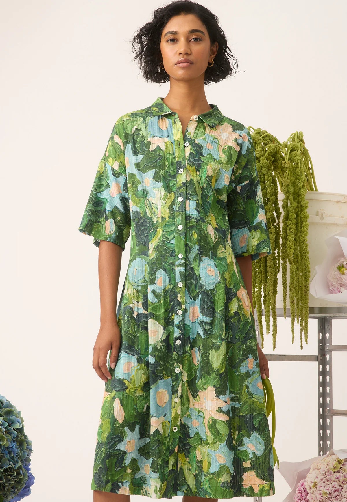 A-line midi length silhouette with darts at front of waist and elasticated panel at back of waist. Short sleeve, collared neckline, shell button through placket and pockets at side seam.