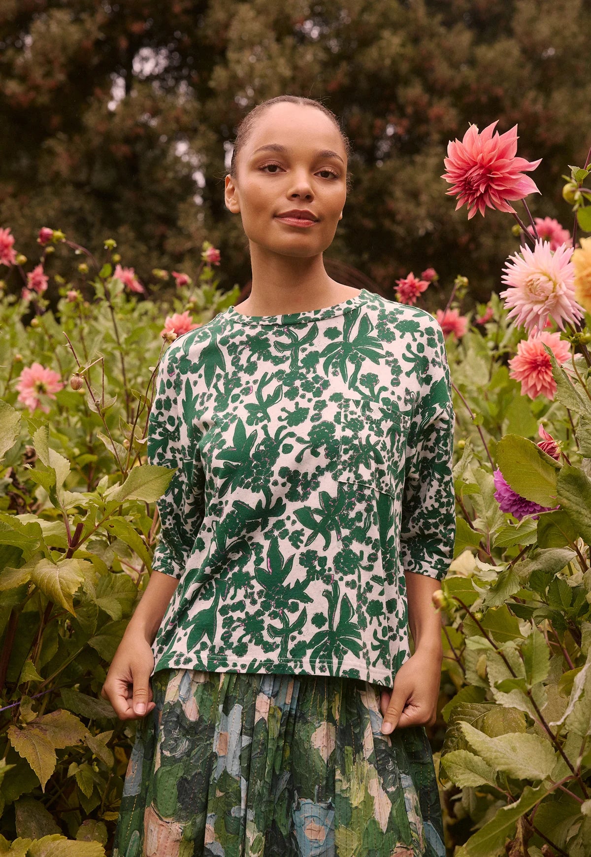 A relaxed boxy fit t-shirt featuring a back yoke, darted sleeve detail and a patch pocket on the front left of bodice.