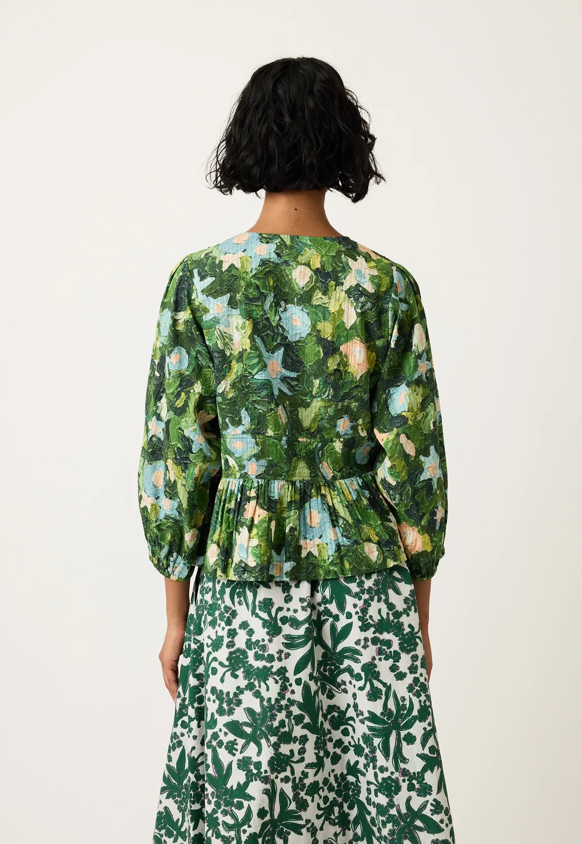 The Mabel Top features mid-length sleeves, a wrap bodice detail. Side zip and 2 button closure at shoulder, decorative 3 wooden buttons at side of waist. The under layer gathers at the waist seam, creating a flattering peplum-style finish.