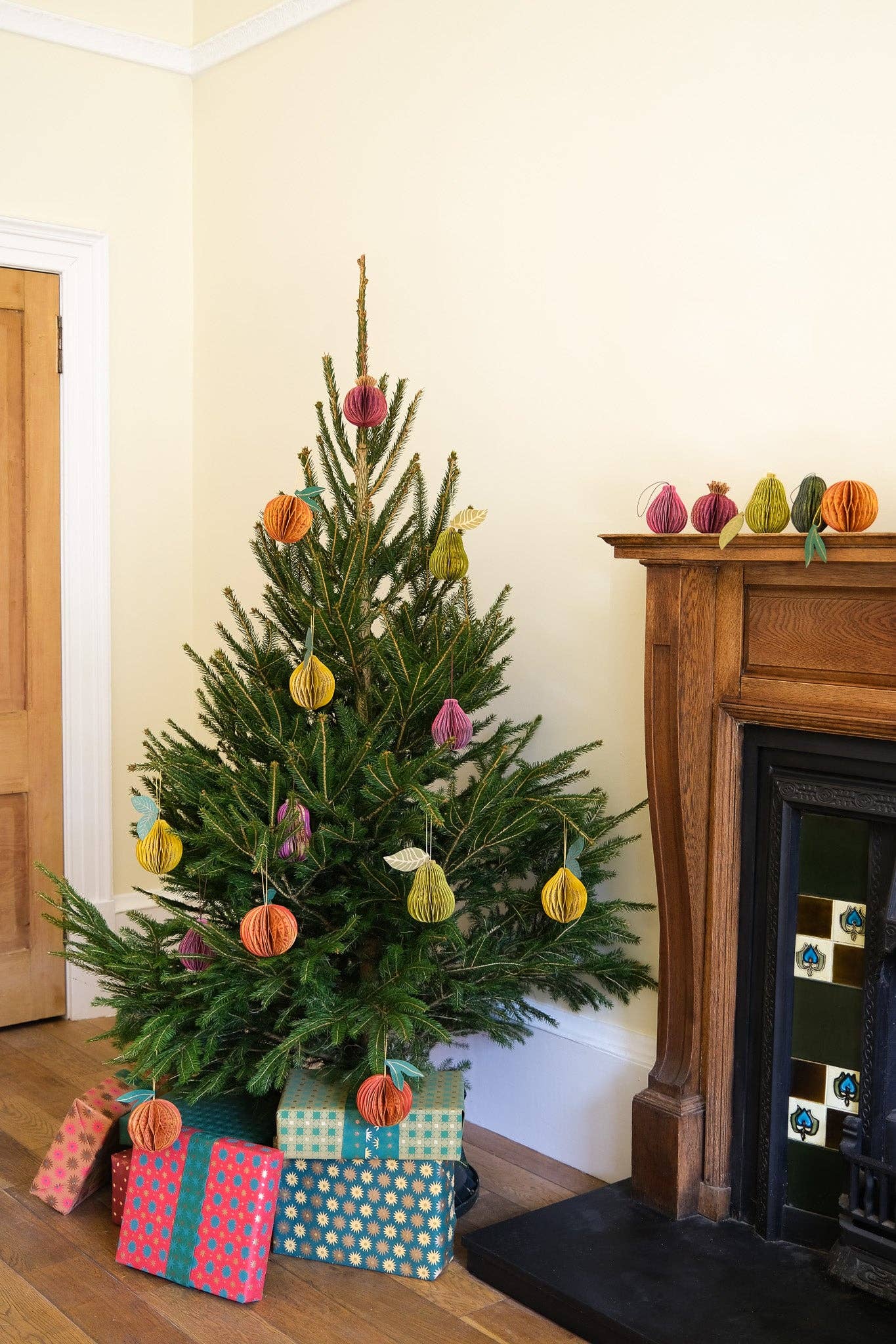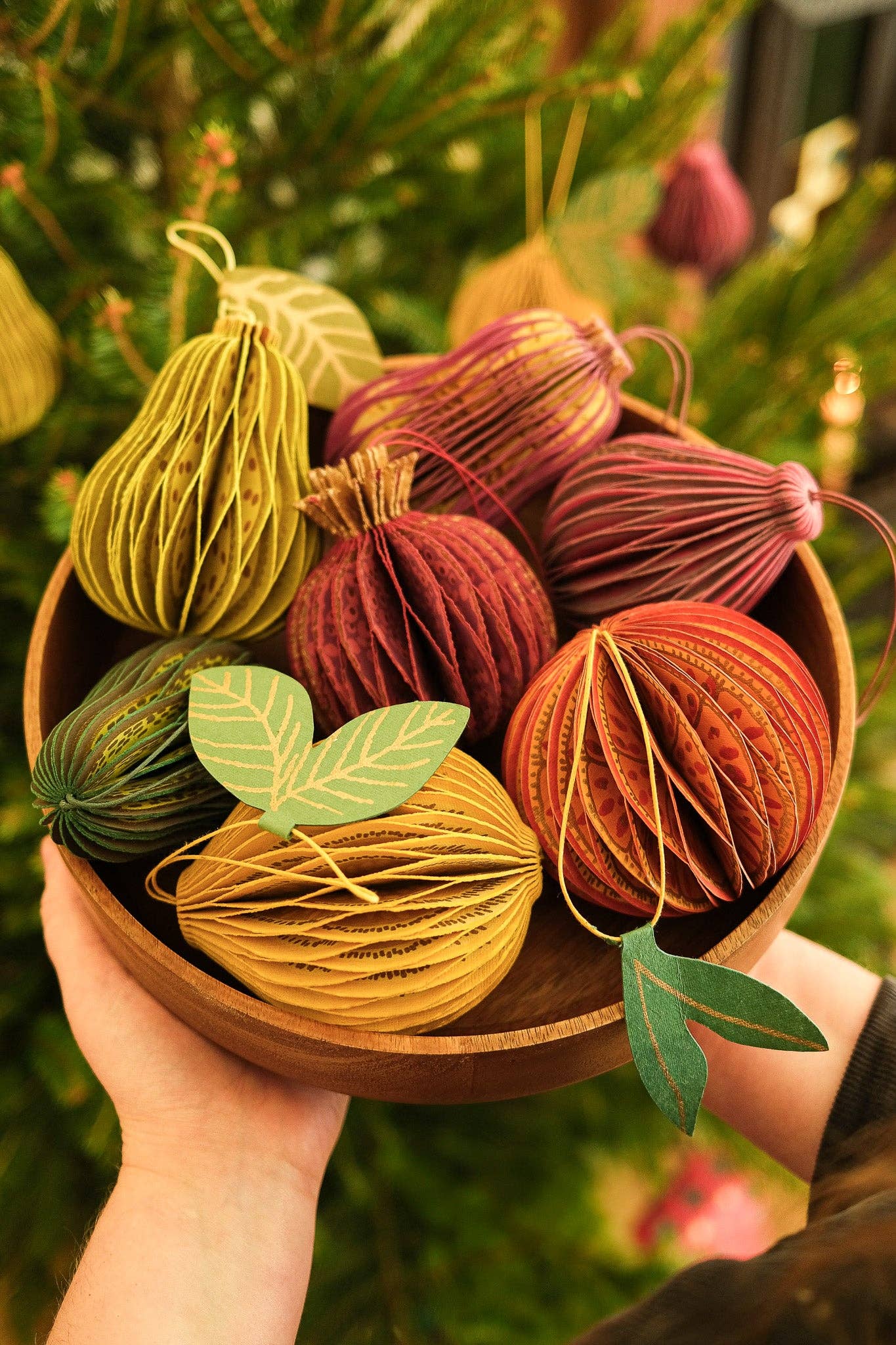 - One pomegranate bauble-shaped paper ornament with a cotton hanging loop - Each secured with a magnet - Screen printed by hand by talented artisans in Jaipur - Sustainably made from recycled materials