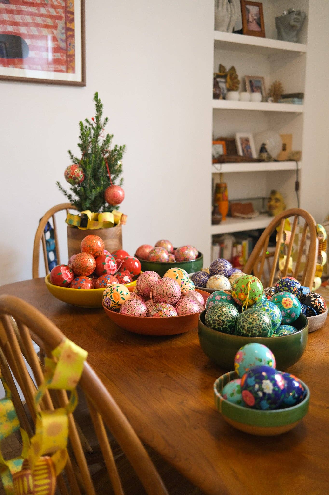 These beautiful baubles are all made from papier mâché recycled paper, hand-painted with intricate, colourful designs, and have a soft cotton thread hanging loop.