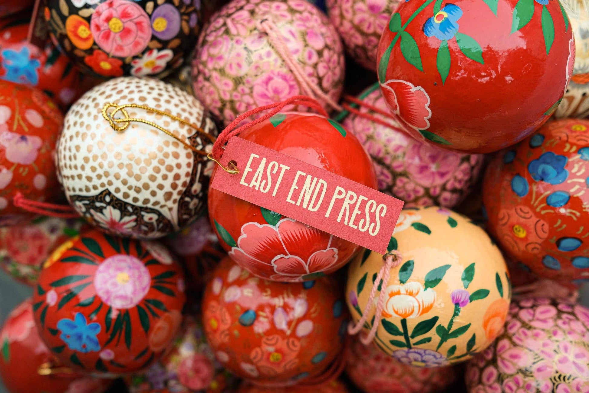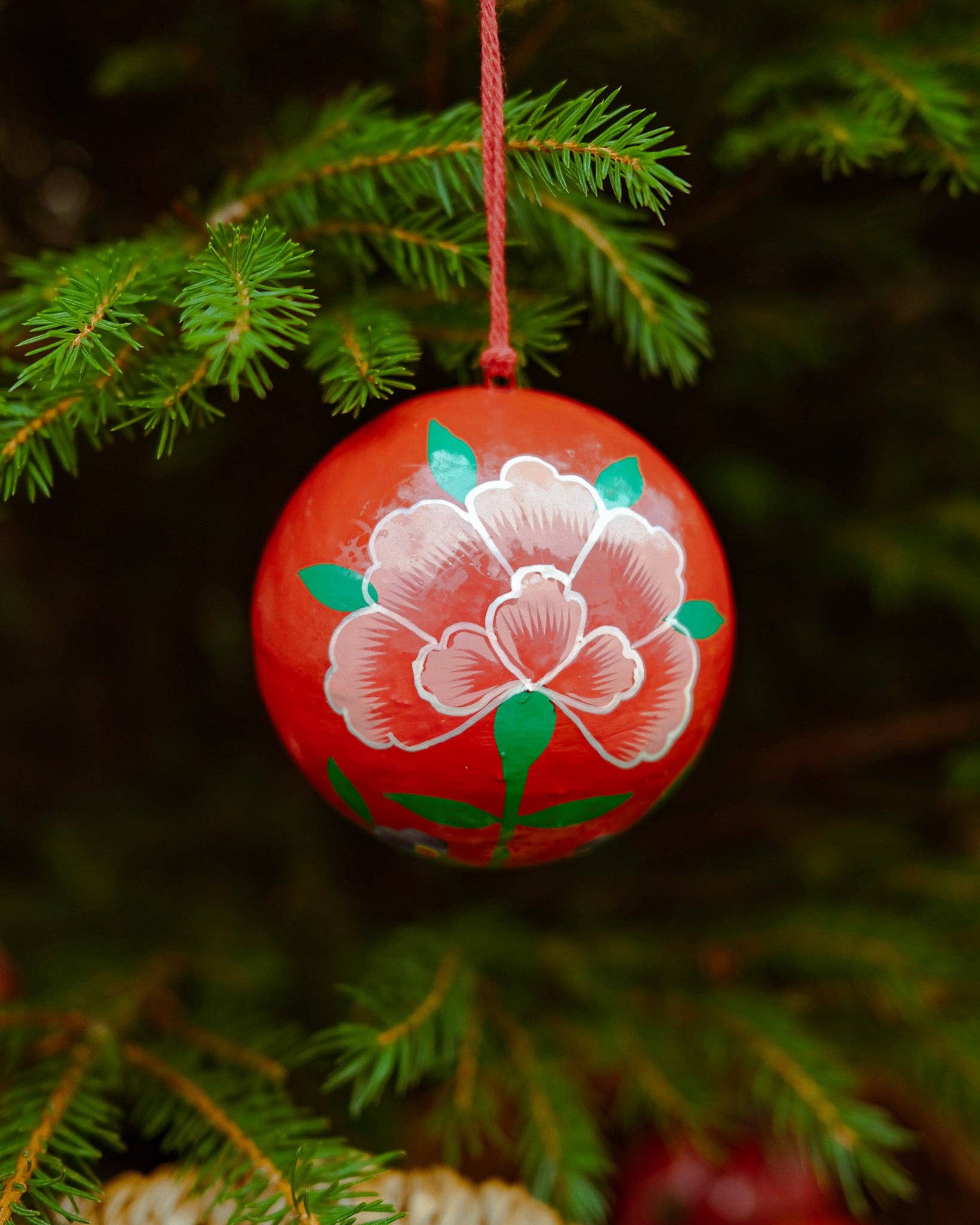 These beautiful baubles are all made from papier mâché recycled paper, hand-painted with intricate, colourful designs, and have a soft cotton thread hanging loop.
