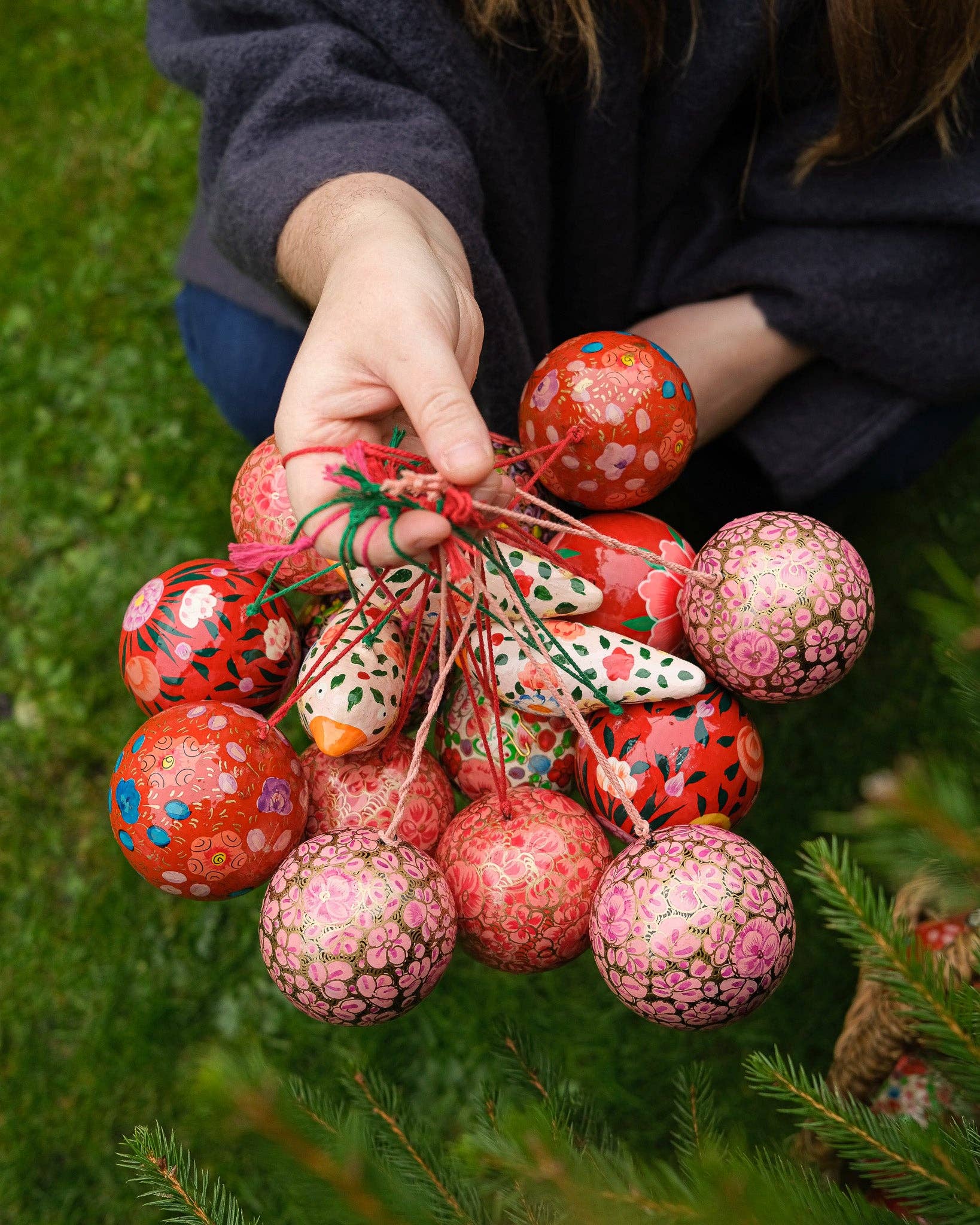 These beautiful baubles are all made from papier mâché recycled paper, hand-painted with intricate, colourful designs, and have a soft cotton thread hanging loop.